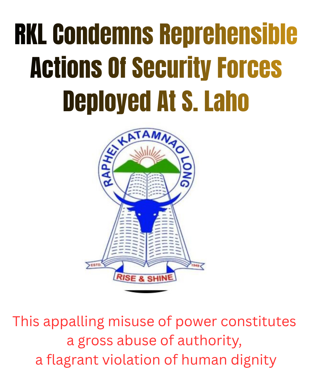 The Raphei Katamnao Long (RKl) - the apex student body of Northern Tangkhul has strongly condemned the reprehensible actions of Indian Security Forces deployed a S. Laho who have perpetrated…