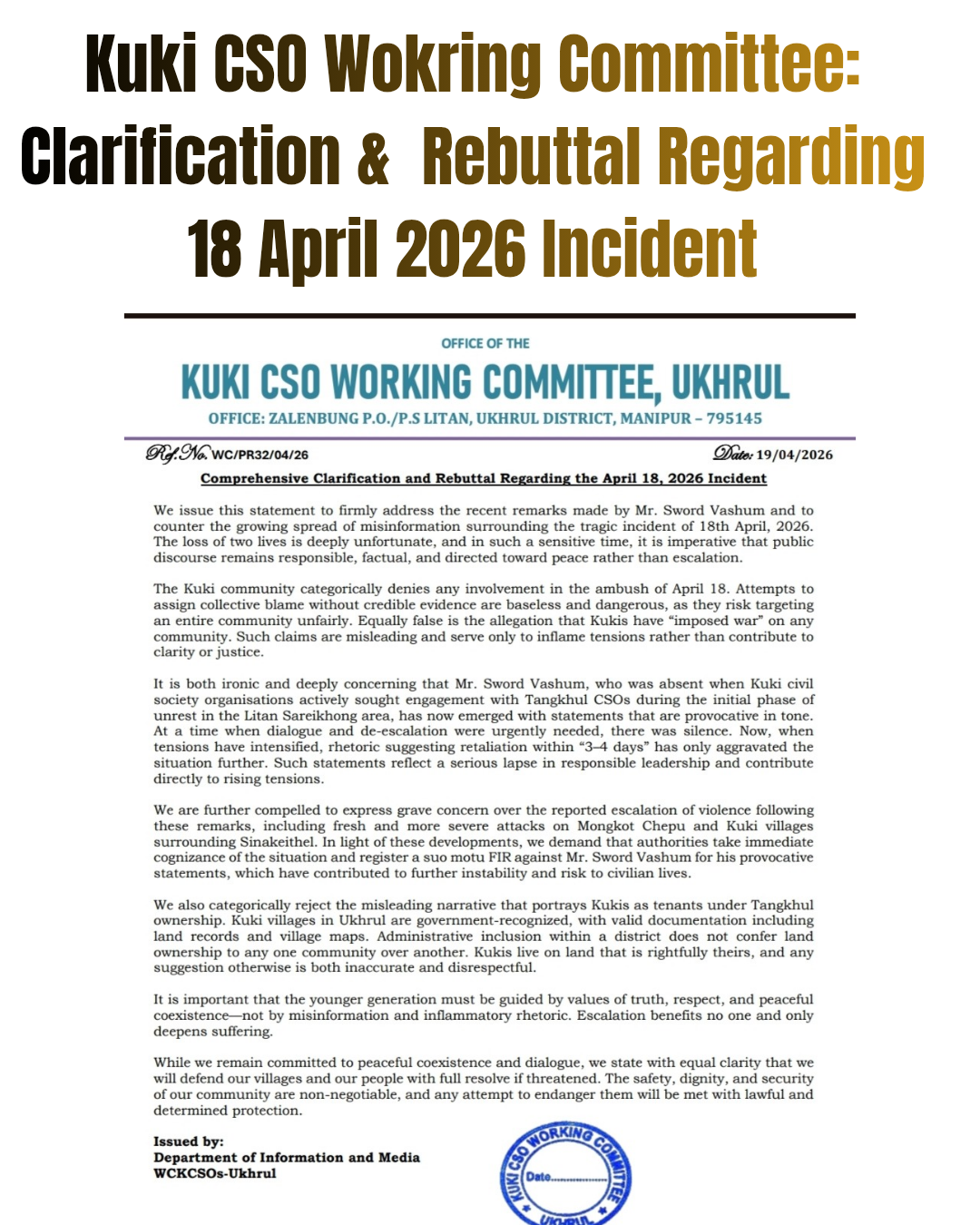 The Kuki CSO Working Committee Ukhrul on Thursday issued a preventive notice regarding the proposed visit of the Chief Minister of Manipur at Ukhrul Headquarters on 17 April 2026. The…
